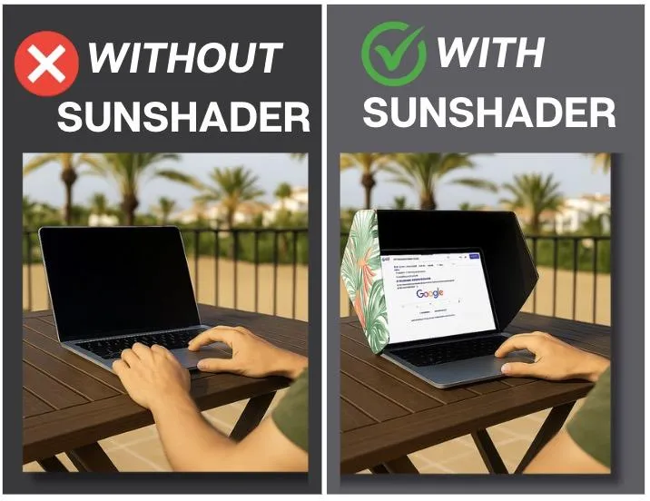 It’s a foldable sun shield you clip on your laptop — so you can actually work outdoors without glare.